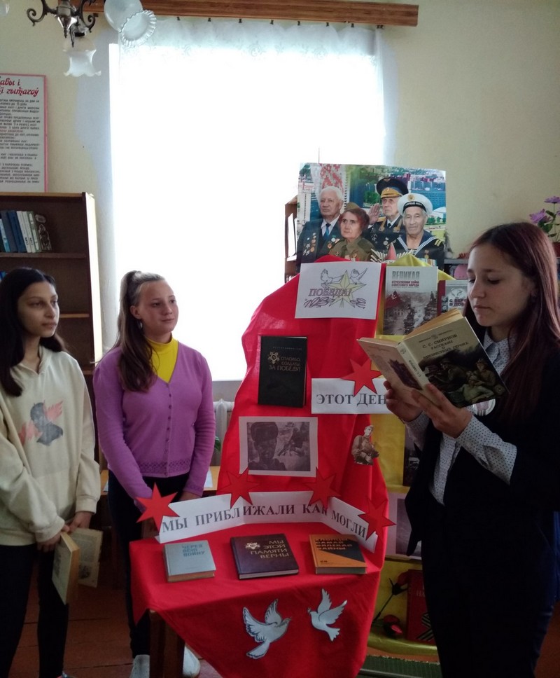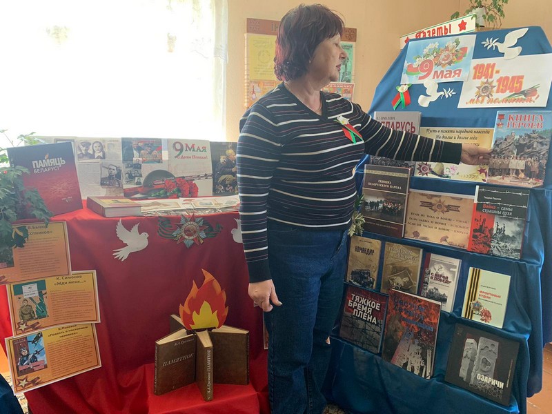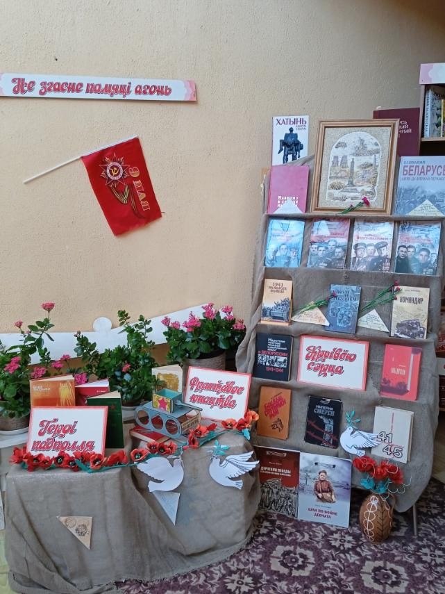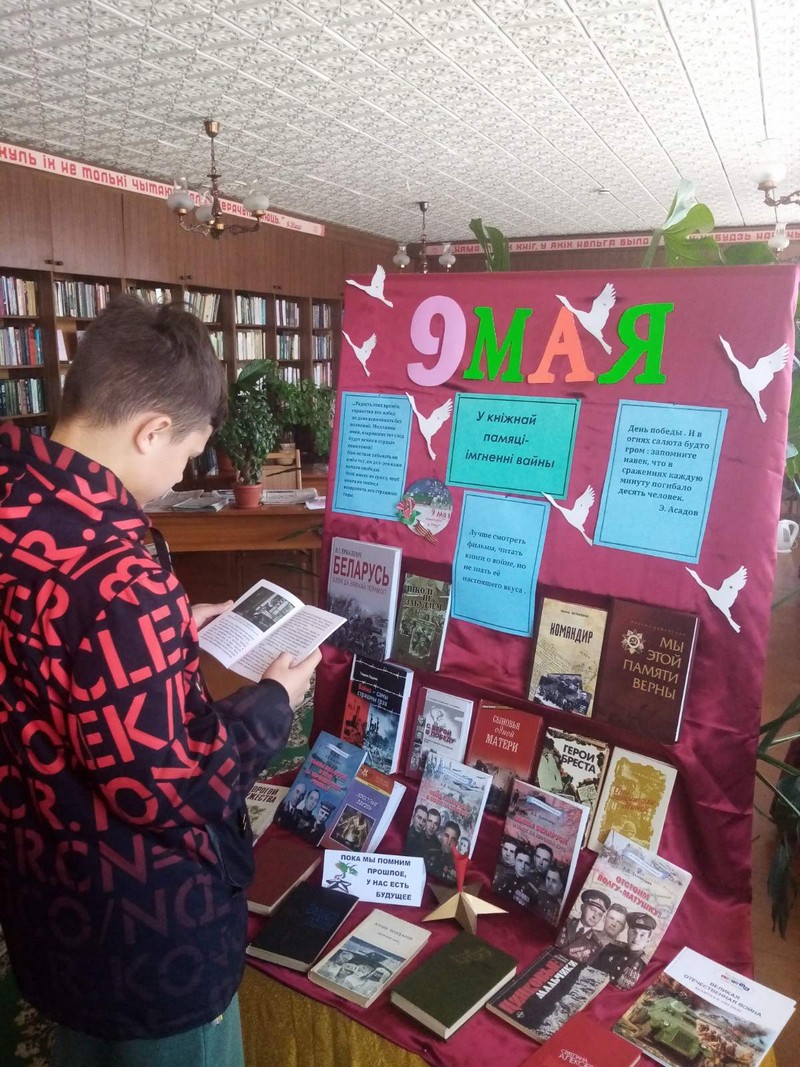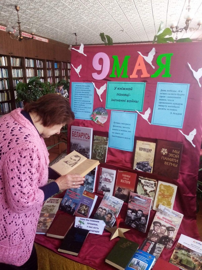 Тэма Вялікай Айчынная вайны знайшла шырокае адлюстраванне ў кніжных выставах, тэматычных паліцах, праглядах літаратуру ва ўсіх бібліятэках раёна: “Наша Перамога”, “Ніхто не забыты, нішто не забыта”, “Подзвіг і слава народа”, “У кніжнай памяці імгненні вайны”, “Крывёю сэрца” і інш.