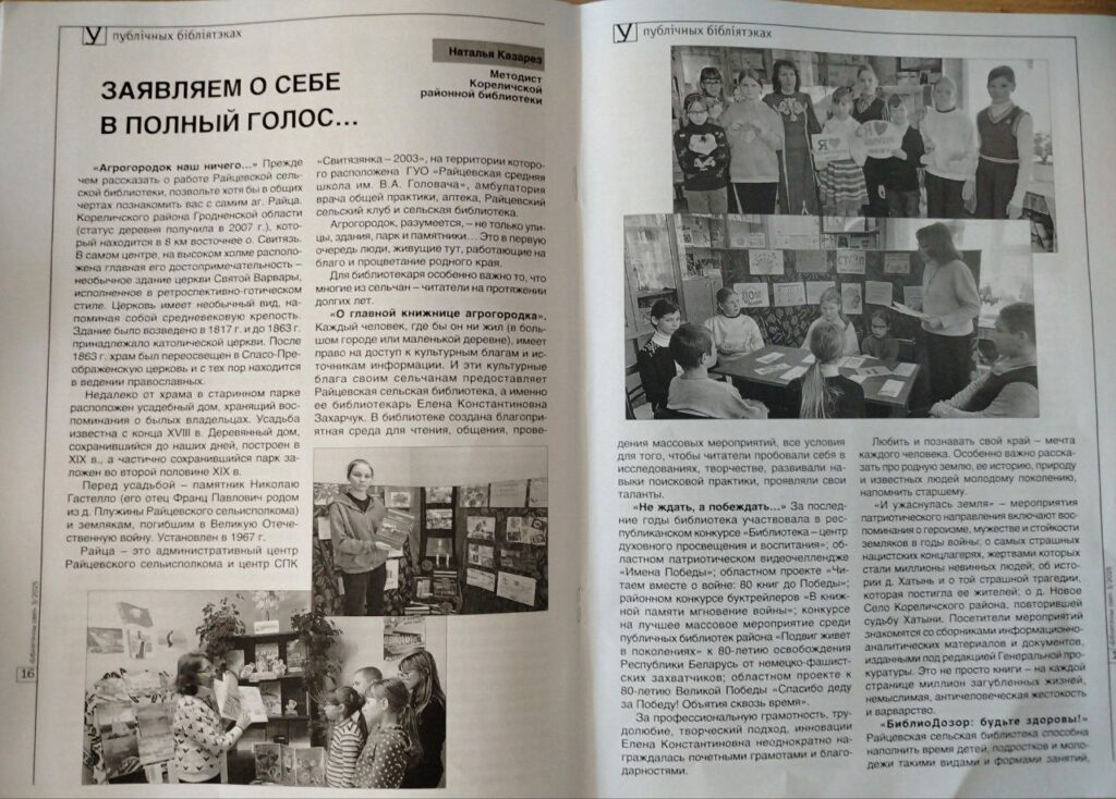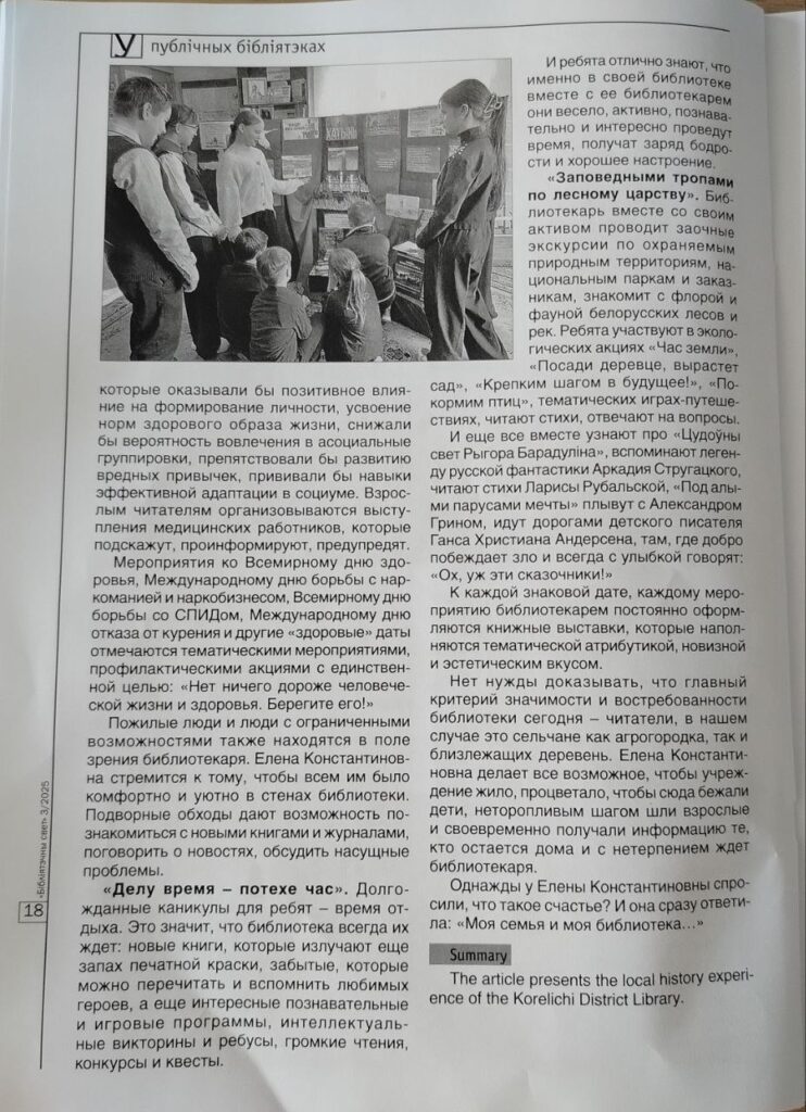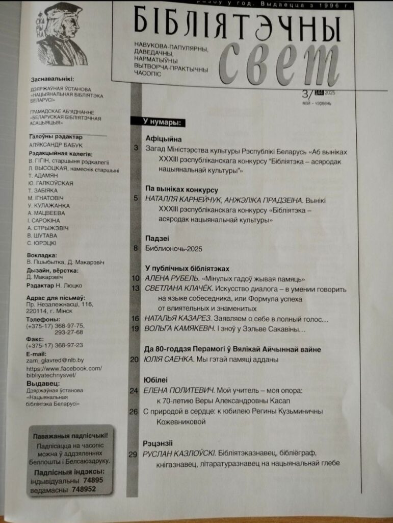 Мы в республиканском профессиональном журнале «Бiблiятэчны свет» № 3 за 2025 год. О работе библиотекаря филиала «Райцевская сельская библиотека» ГУК «Кореличская районная библиотека» Захарчук Елены Константиновны можно прочитать в статье «Заявляем о себе в полный голос…», написанной Натальей Казарез, методистом сектора маркетинга, социокультурной деятельности и методической работы. В этом же номере также размещена статья о победителе в республиканском конкурсе «Бiблiятэка — асяродак национальный культуры» Полужской сельской библиотеке.