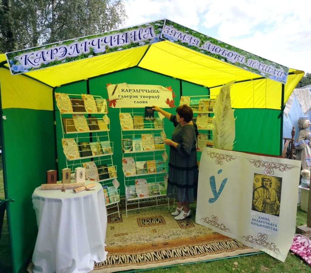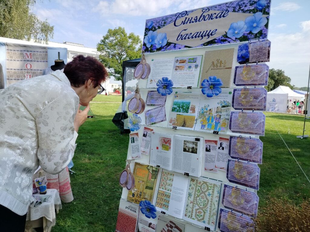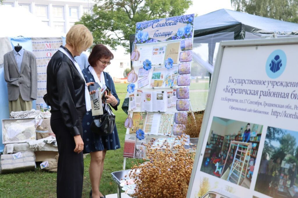 Сотрудники ГУК «Кореличская районная библиотека» в День белорусской письменности организовали библиотечную площадку «Карэліччына — зямля любові нашай». Была представлена книжная выставка «Карэліччына: галерэя творцаў» и тематическая информационно-книжная выставка “Сінявокае багацце”. На организованной интерактивной площадке «Льняная круговерть» знакомили гостей праздника с этапами обработки льна в старину и с предметами, которые использовались для обработки льна. Юным участникам было интересно и познавательно обработать лён в «трепальне». Узнали об истории возделывания этой культуры, использовании в кулинарии и медицине, а также другие познавательные факты, связанные со льном. Дети и взрослые знакомились с продукцией ОАО «Кореличи-Лён», с выставкой льняных изделий «Роднае — Моднае». Ребята активно участвовали в интерактивных играх, собирали пословицы и разгадывали загадки о льне. Много слов благодарности от детей и взрослых библиотекари услышали за организованную площадку.