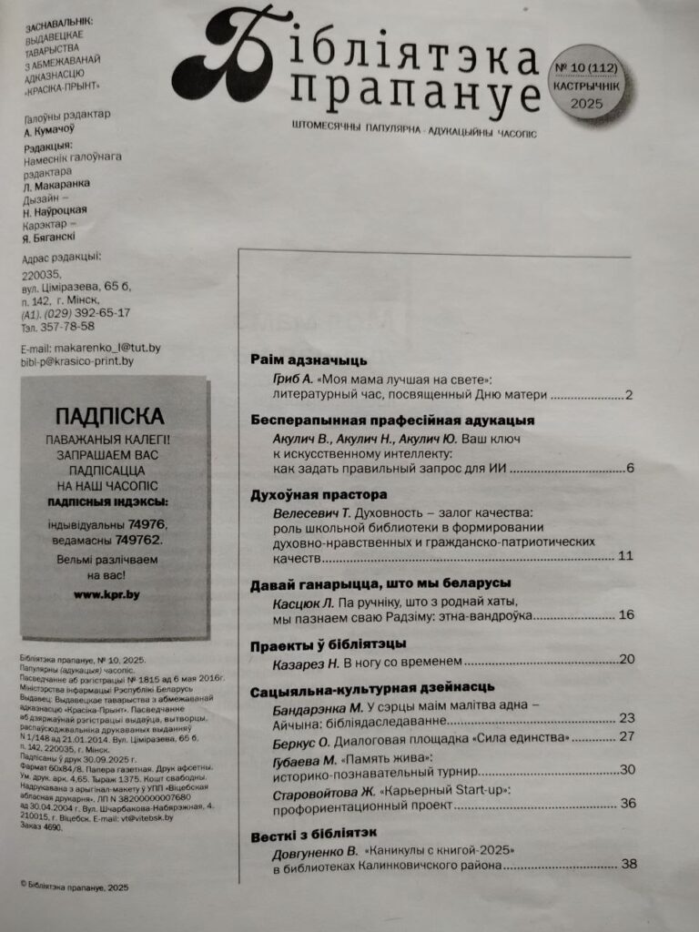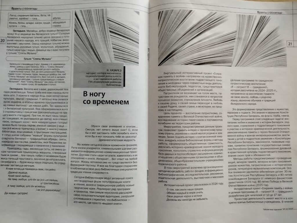 Навіны Мы в СМИ 13.10.202513.10.2025 Dima 0 Comments В республиканском профессиональном журнале «Бiблiятэка прапануе» № 10, 2025 г. опубликована статья методиста сектора маркетинга, социокультурной деятельности и методической работы Н.В. Казарез о проектной деятельности библиотек.