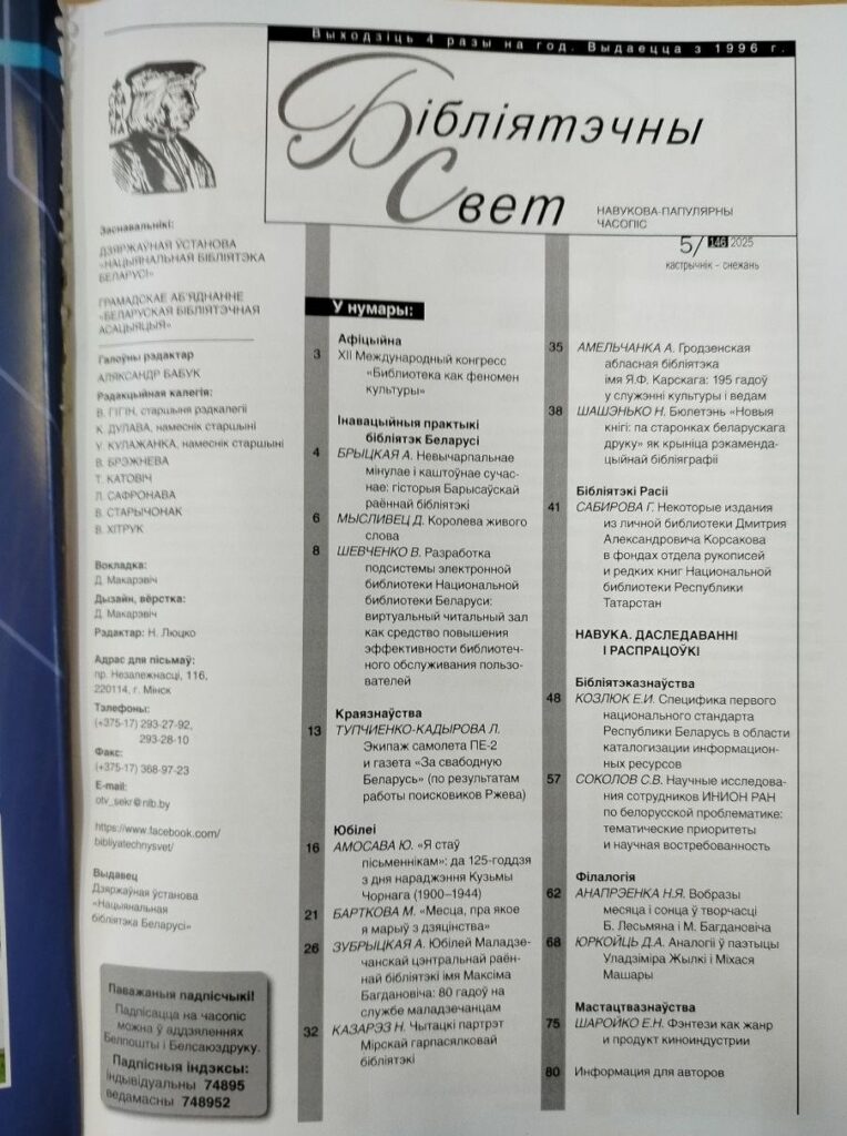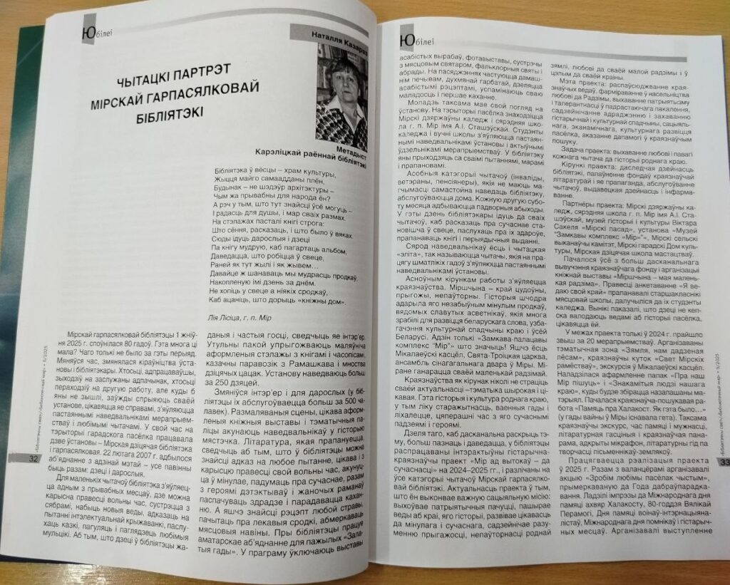 В журнале «Бiблiятэчны свет» №5 за 2025 год опубликована статья Натальи Казарез, методиста сектора маркетинга, социокультурной деятельности и методической работы ГУК «Кореличская районная библиотека» «Чытацкi партрэт Мiрскай гарпасялковай бiблiятэкi». В этом году библиотека отмечает 80-летие со дня образования.