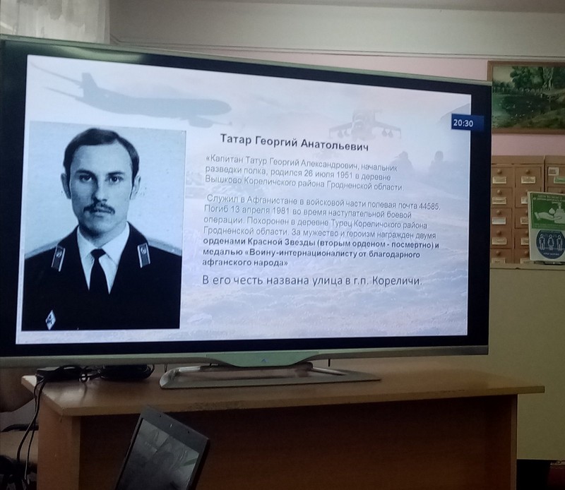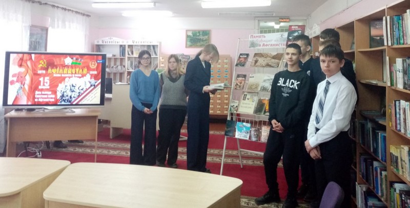 15 февраля отмечается памятная дата — День памяти воинов-интернационалистов. В этот день в Кореличской районной библиотеке проведён урок памяти «Наша память и боль – АФГАН». На мероприятии присутствовали учащиеся 9 класса ГУО «Средняя школа №2 г.п. Кореличи». Во время мероприятия подростки узнали, что в этот день исполнилось 34 года со дня вывода Советских войск из Афганистана, что именно в этот день закончилась война, которая длилась в два раза дольше, чем Великая Отечественная. Также ребята услышали о том, что 77 молодых ребят нашего района были призваны на службу в Афганистан, 4 не вернулось домой. Также на мероприятии присутствовал воин-интернационалист, участник войны Манько Александр Николаевич, который поделился своими воспоминаниями. В рамках мероприятия оформлена одноименная книжная выставка.